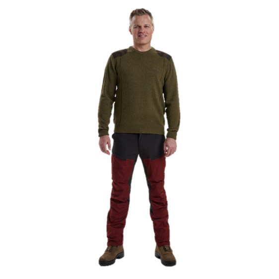 En tradisjonell, men stilig lammeullsgenser med tilsatt elastan for å beholde fasongen og et klassisk rundhalset design. Genseren har semskede skulder- og albuelapper i en matchende farge.